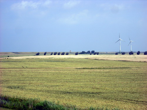 >>Windräder, im Hintergrund der Leuchtturm von Pilsum<<